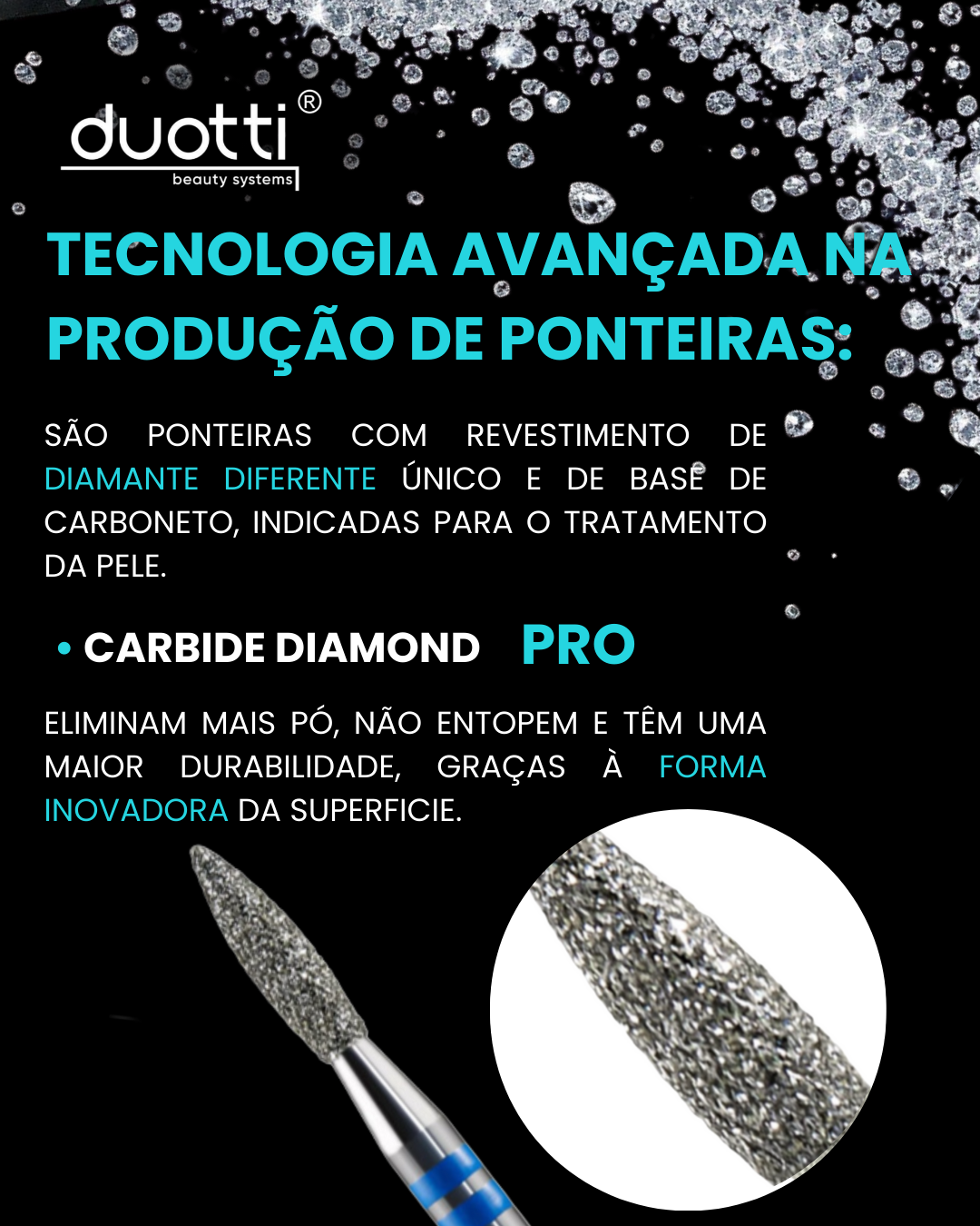 Ponteiras das séries CARBIDE DIAMOND PRO e CARBIDE DIAMOND COLD – são ponteiras com revestimento de diamante diferente único e de base de nano carboneto, indicadas para o tratamento da pele.